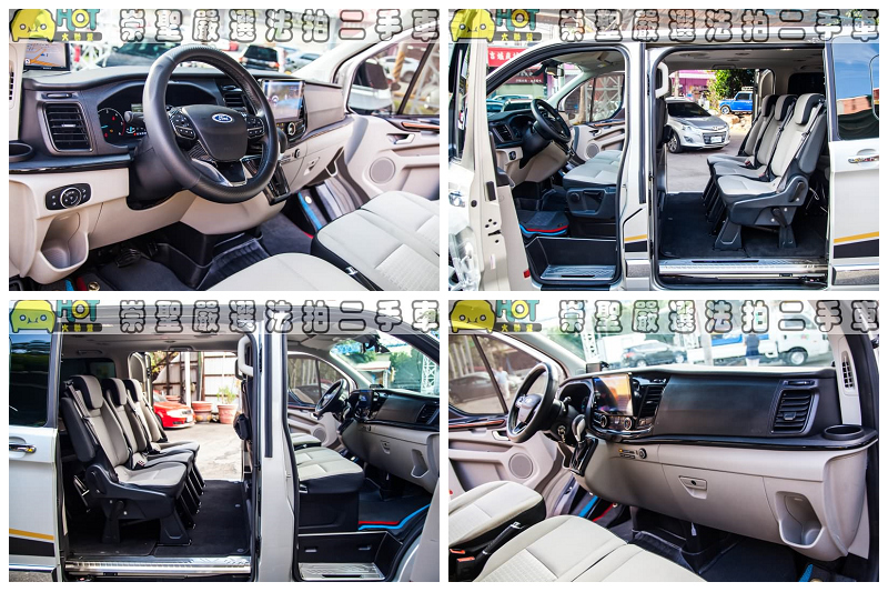 在內裝上,Tourneo Custom 旅行家全採用2+3+3的八人乘坐配置,完整獨立的座椅配置,滿足全車乘客的空間需求。其中豪華型座椅更以全新皮革縫紉技術輔以貼合人體工學的座椅泡棉設定,並擁有駕駛座10項電動調整功能,每一位駕駛都能找到切合自己習慣的駕駛位置。而獨立座椅設計可提供傾倒、翻折、拆卸、對座與收納的方式,創造超過32種應用模式,輔以中央座椅椅背的桌面配置,完美符合各式商務使用需求。多變靈活的座椅運用,輔以最大1,930L行李廂空間,創造領先同級的空間應用性。新設計的中控台不僅帶來遼闊的絕佳視野,亦全新規劃出更多人性化收納空間,包含中控台隱藏式上掀置物空間與排檔座收納空間。全車系配備4組ISOFIX座椅、最多8個置杯架、10具環艙臨場感揚聲器與8處USB插槽,能在安全移動間亦全時行動不斷電。